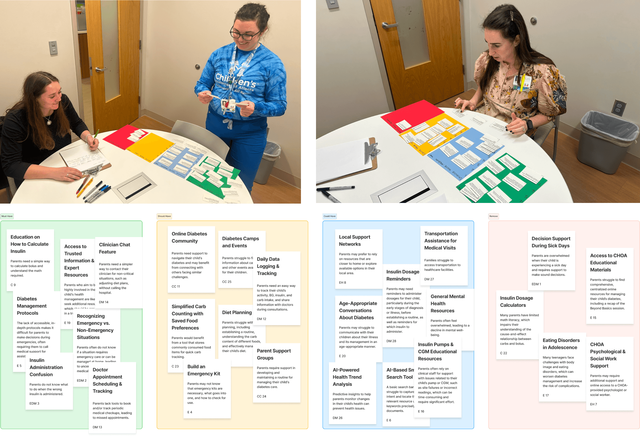 Affinity mapping of parent and clinician inputs, grouped by key themes.