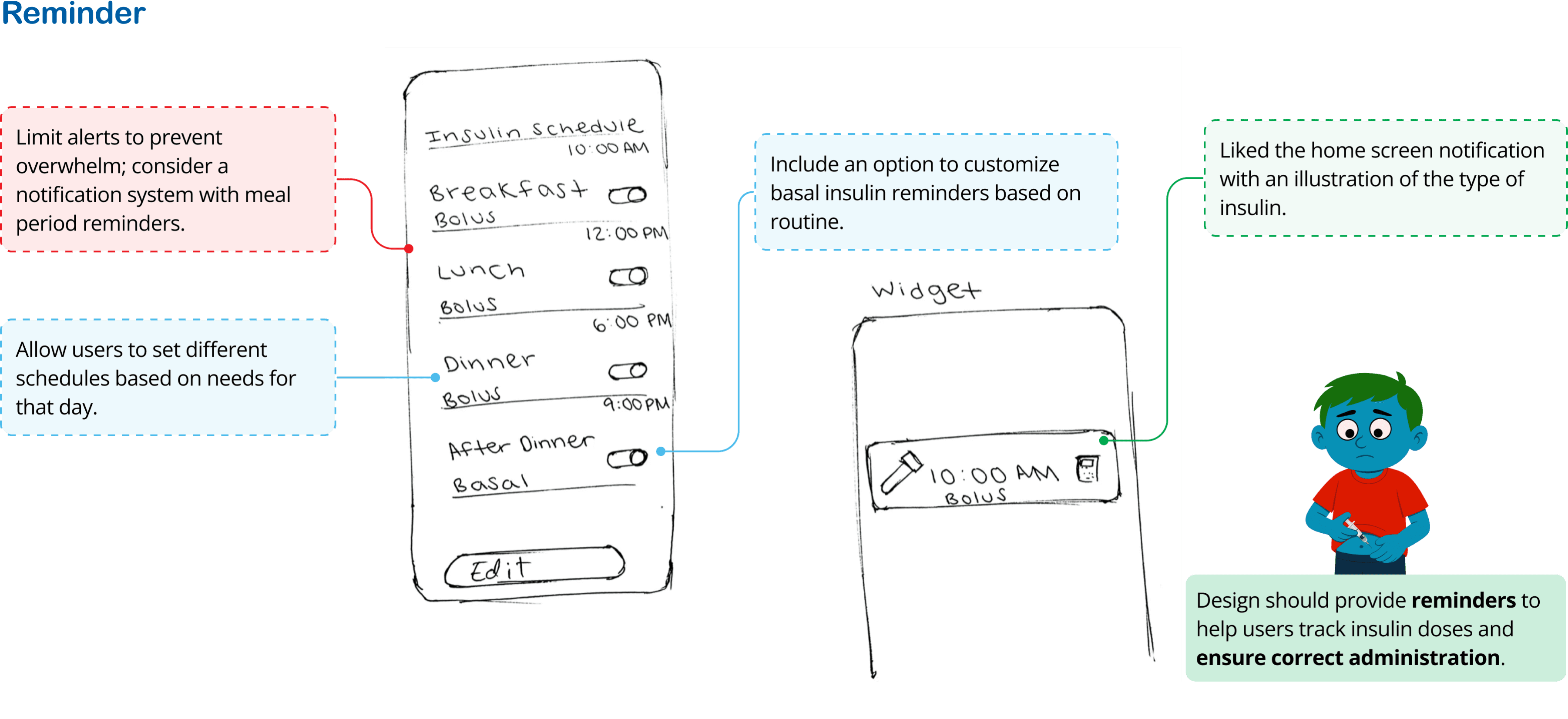 Reminds users to take insulin, specifying long-acting or short-acting, easily accessible through the lock screen widget for quick access.