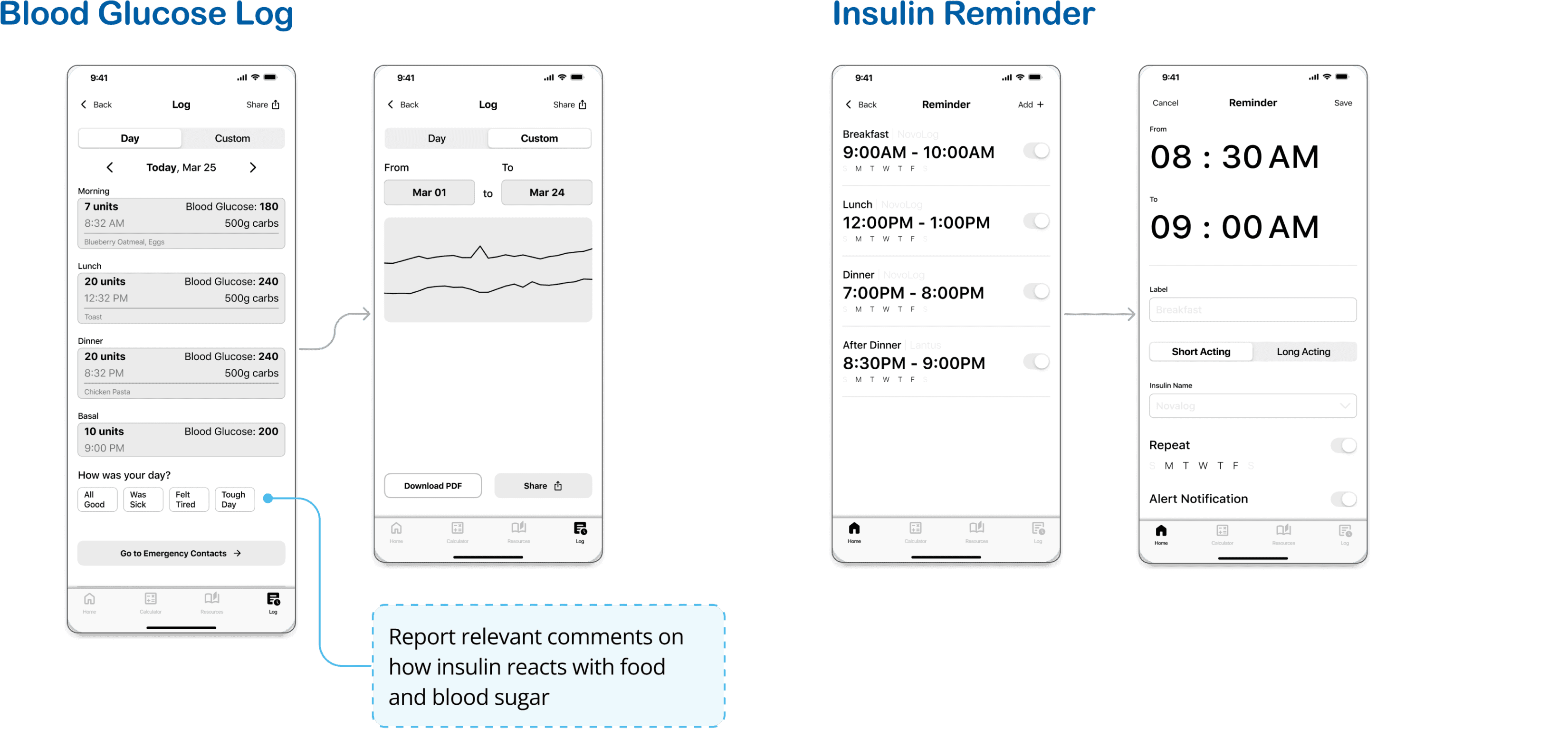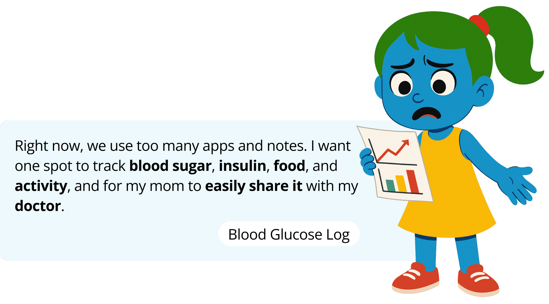 Users can visualize BG trends over a custom period and export the log to clinicians, making it easier to identify patterns and enhance healthcare collaboration.
